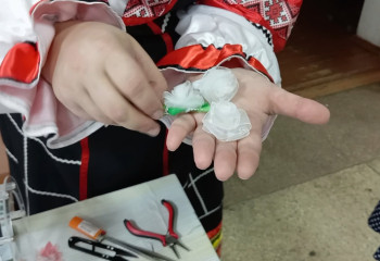На мастер классе Калюкаева Ксения рассказала и показала как делать заколку-резиночку. Технология очень проста, не требует больших затрат времени и дорогостоящих труднодоступных материалов: из ленты вырезаются заготовки для листиков и лепестков цветка, края опаляются зажигалкой, затем все заготовки собираются в один большой цветок. Крепится все при помощи клеевого пистолета. Таким цветком можно украсить не только заколку, но и ободок, брошку, он может стать частью декора одежды или предметов интерьера.